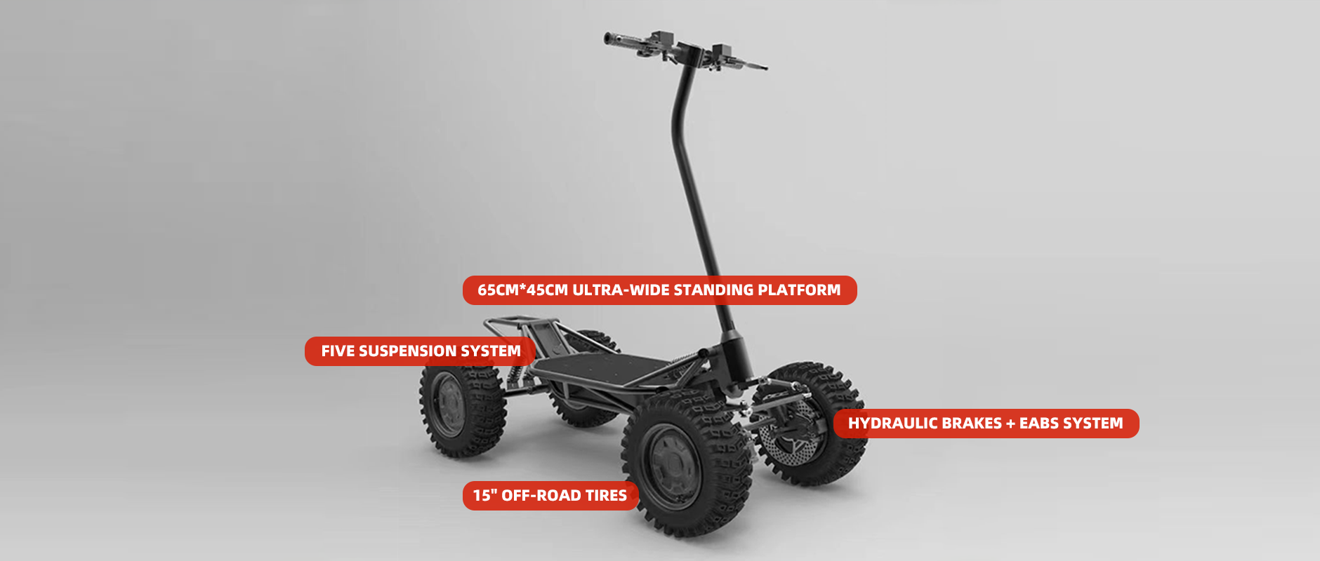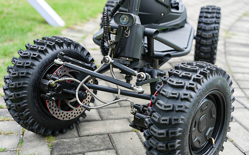 Front wheel split independent suspension allows each wheel to adapt to the terrain independently, with a total of 5 sets of suspension systems (front 1, rear 2 springs + two damping cushions),ensuring high stability and comfort during your ride.